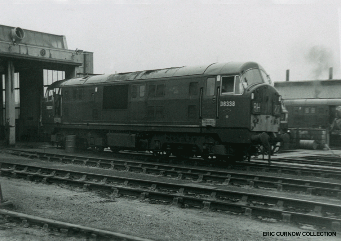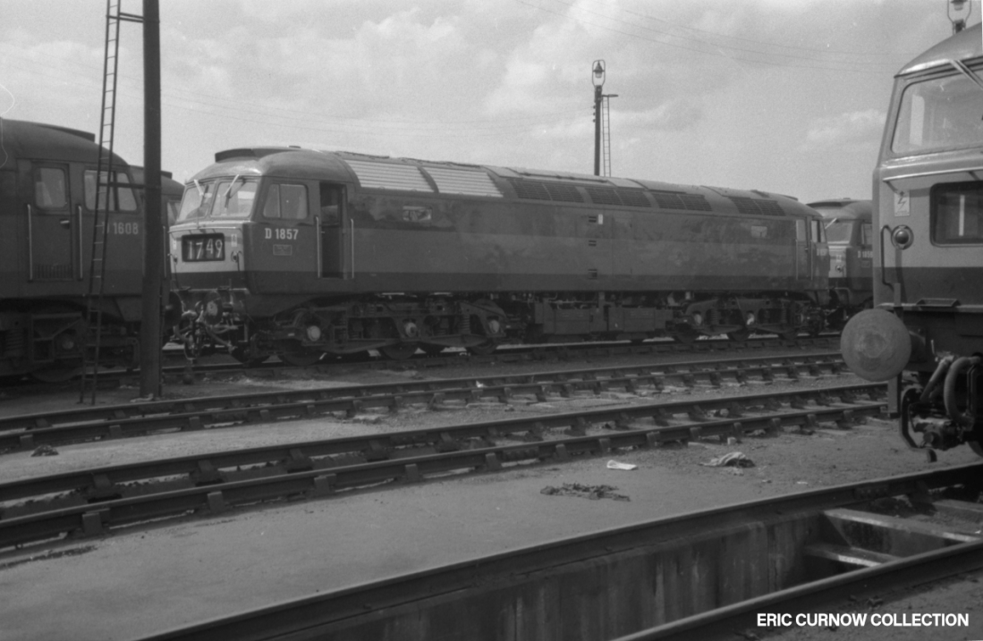 Below lighting towers and before an inspection pit, new-to-traffic D1857 and D1858 are pictured with older class mates at Bristol Bath Road in 1964, all in two-tone green livery, with a glimpse of a ‘Western’ behind them. With so many diesel electrics together, it appears “the writing is on the wall” for hydraulics. Photo: William Kerry. 64##AH01-BBR-D_LCO-PARKD