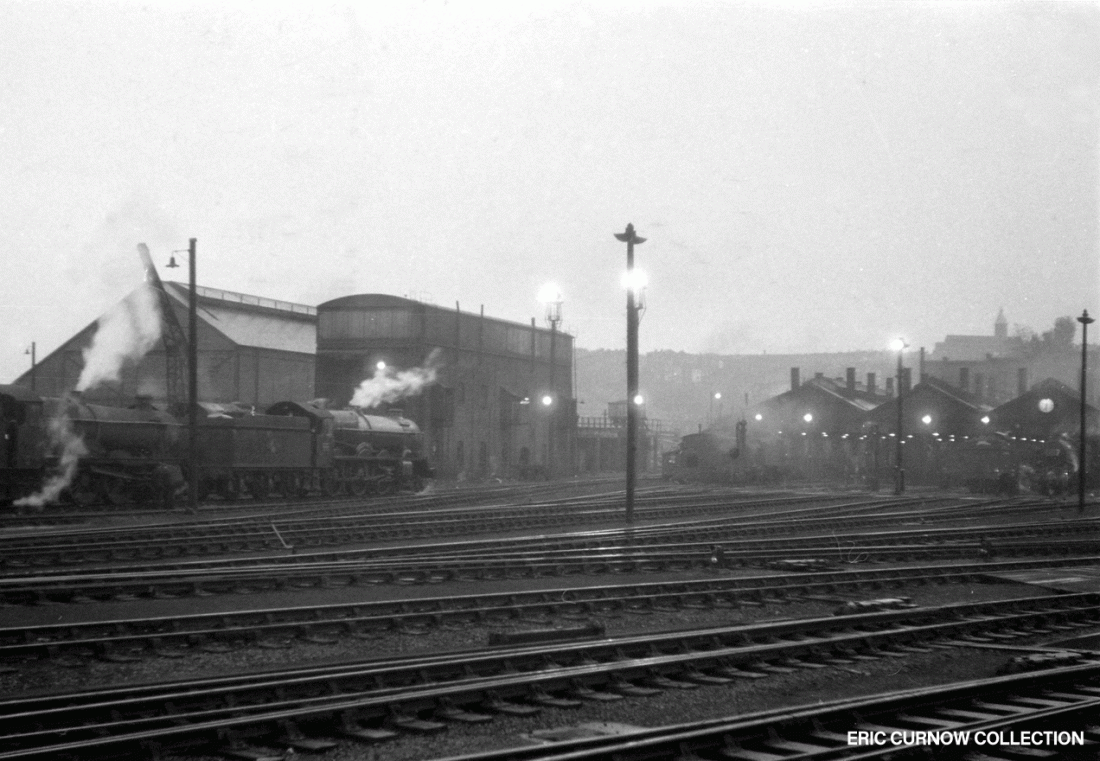 The lights go on as evening sets in on Bristol Bath Road Shed on 10th October 1959. An array of steamers are parked to the left and sentinel in the middle is the huge coaling stage with water tank on top of it. The running shed seems to be awaiting locos. 591010A01-BBR-DEPOT-VI__E