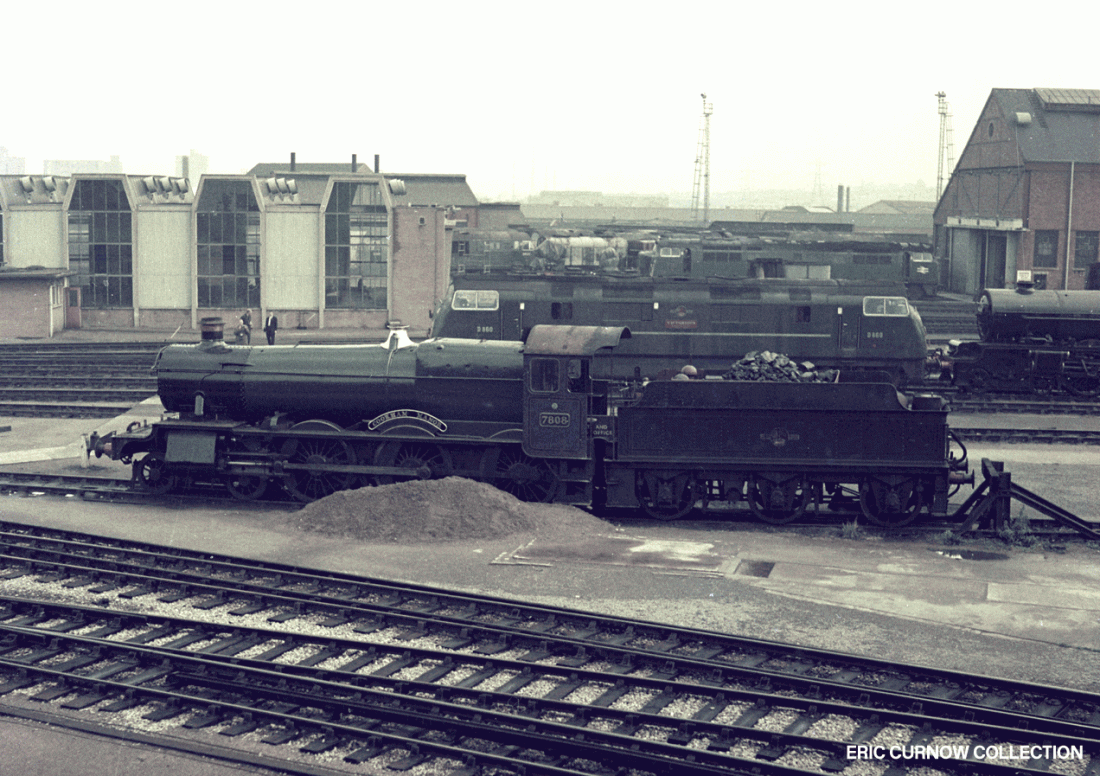 Early arrivals at Bristol Bath Road depot for the open day finds 7808 “COOKHAM MANOR” parked with a Jubilee, D860 “VICTORIOUS”, a ‘Western’ and D63XX. This view clearly shows the extractor fans on the shed roof, and the maintenance shed. 681019A01-BBR-LOCOS-PARKD