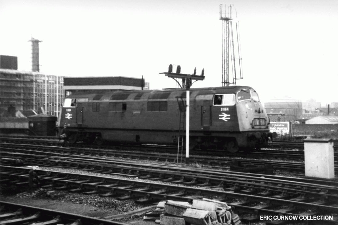 Among many empty tracks and in the early years of its life, the first of its class, D800 “SIR BRIAN ROBERTSON’ arrives light engine at the east end of Bristol Temple Meads Station. It has not had yellow warning panels or headcode boxes on its front ends. 60###AG01-BTM–D800-LIGHT