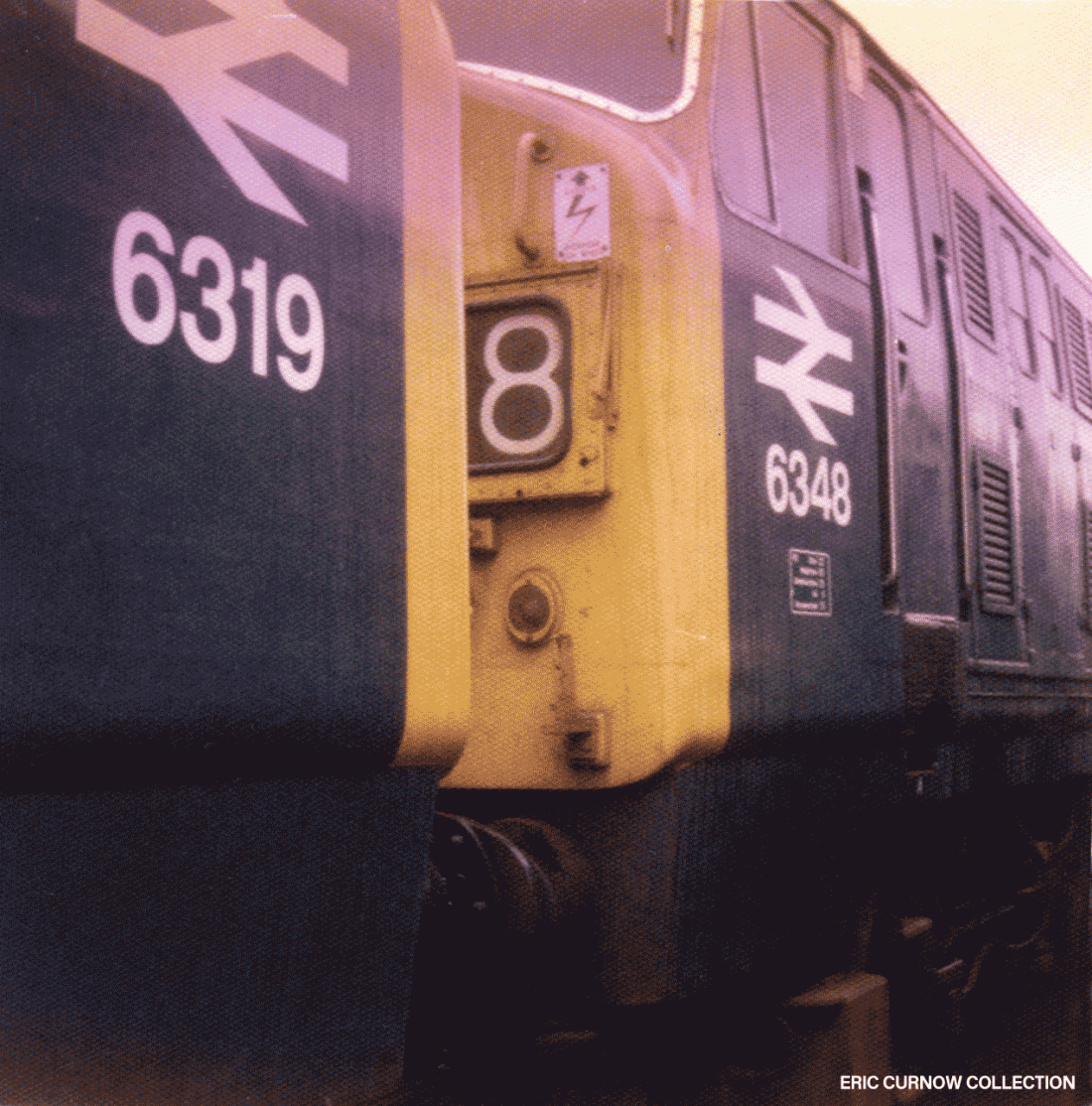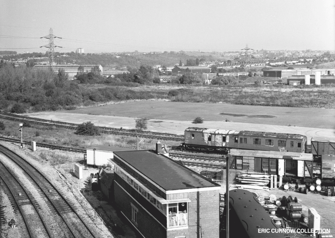 These sidings at St Philip’s Marsh contain 6319 in presentable blue livery, D815 in pock-marked maroon and 867 apparently hit by a paint pot, all due for disposal. The building at far left is the Royal Mail facility next to Temple Meads Station, further west. 72###AD01-SPM–D8XX-PARKD