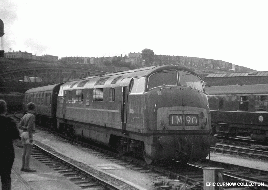 Heading a “Midland” service, D850 “SWIFT” runs into view between two other trains, attracting train spotters at the west end of Bristol Temple Meads Station. An hatch in the ventilation grille for filling the steam boiler is open on the loco’s side. Photo: Peter Noonan. 670902A01-BTM–D850-PAS_U