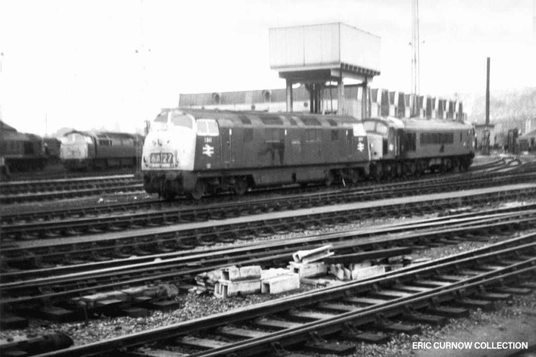 Class 43 Warship D841 Roebuck is coupled to a ‘Peak’ beside Bristol Bath Road in 1969. Above them is the depot’s water tank, and in the background a ‘Western’ and ‘Peak’ in green livery. The depot building is very distinctive, and a worthy successor to the former one. 69###AG01-BBR–D841-PARKD
