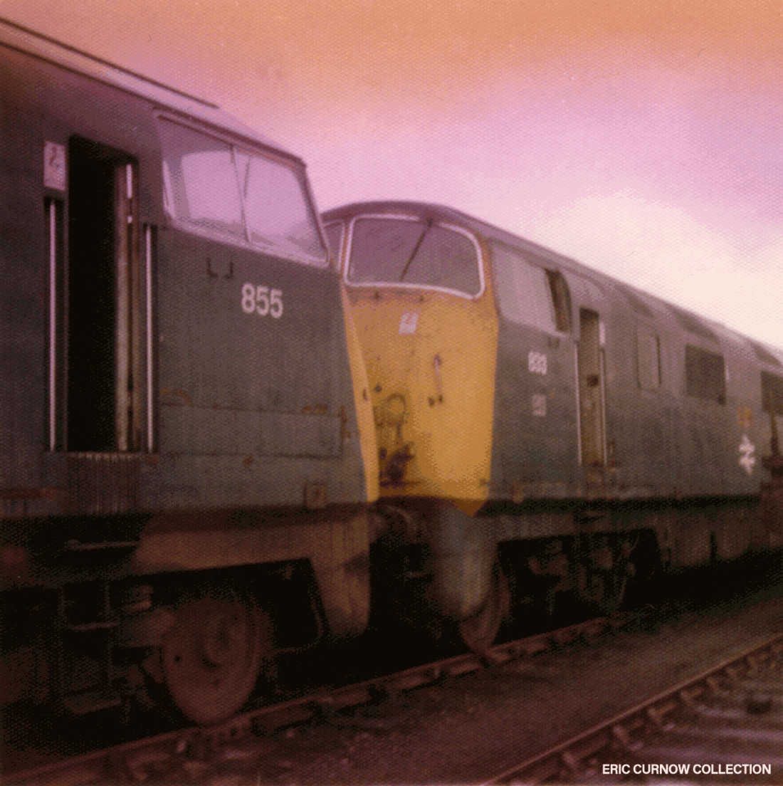 Three ‘Hymek’s have been shunted together at St Philip’s Marsh awaiting a trip to Swindon for breaking up. They still retain relief lettering and builders plates, not yet removed by souvenir hunters. Concrete beams and a new sleeper lie in a heap before them. 72###AC01-SPM-D7XXX-PARKD