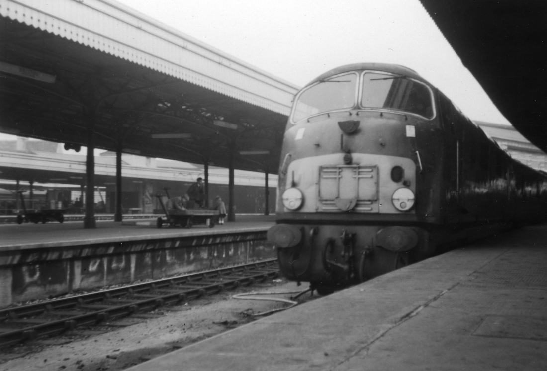D817 ‘FOXHOUND’ releases itself from its inter-regional coaching stock prior to reversing eastwards light engine. and them coming back before the Loco Yard signal box in the background. ‘FOXHOUND’s’ maroon livery is in good shape, and its yellow front end only lightly covered in grime. 670408A01-BTM–D817-PAS_D