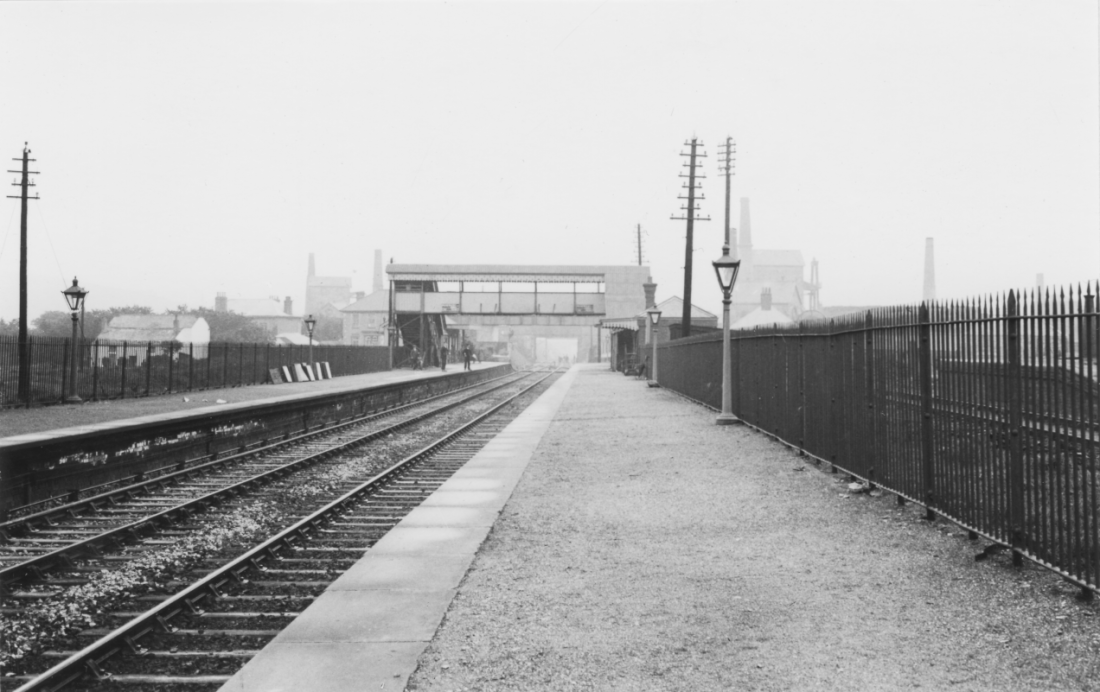 Carn Brea Station looking west on a foggy day in 1922. Behind it are mining engine houses, virtually all now swept away, though the house just behind the left steps to the passenger footbridge is still extant. Gas lighting and spear point railings flank the platforms, and the whole scene gives a well-kept and efficient impression of GWR’s service. Copyright: L&GRP. 22###AB01-CNB-STATN-VI__W