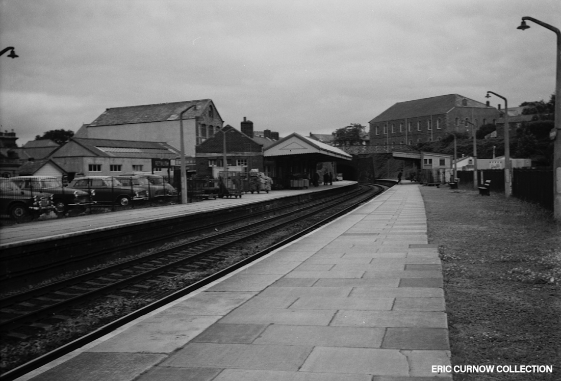 This closer view of Camborne Station’s down platform Waiting Shelter, taken from a departing “up” train, shows a substantial building, with toilet facilities. The Running In Board has lost its bottom bar, and trolleys wait around. 5####AT01-CBN-STATN-VIS_E