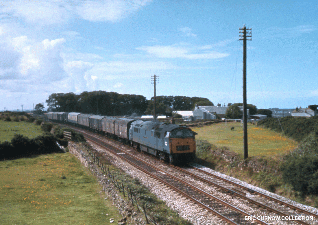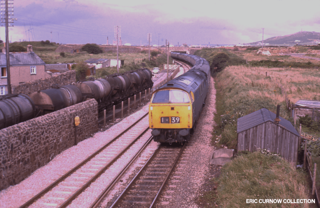 In August 1974, D1056 “WESTERN SULTAN” passes Dolcoath siding between Roskear and Carn Brea with a many-carriaged down service in late afternoon. In the siding to the left milk tanks were filled from road tankers and hoses, and up trains from Penzance or St Erth would stop beyond the white gates, reverse in and couple up before continuing eastwards. 7406##A04-CBN-D1056-PAS_D