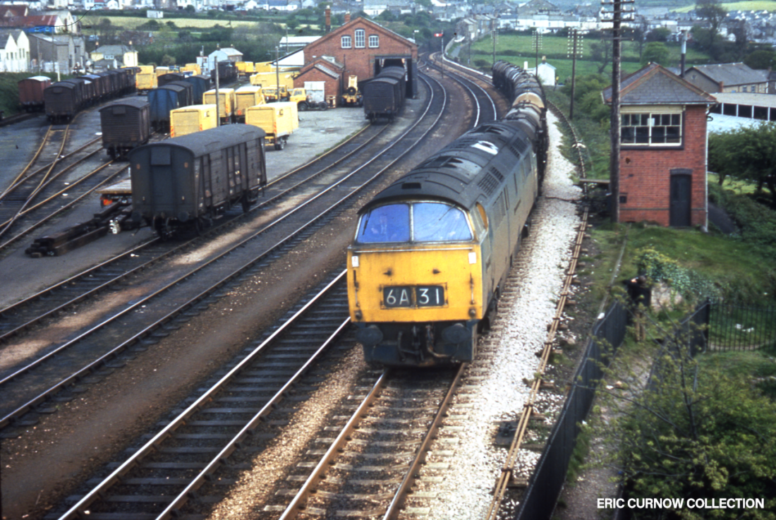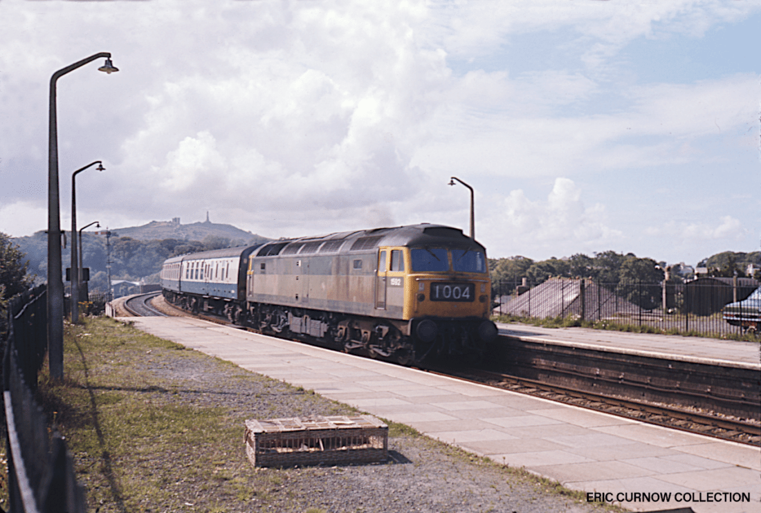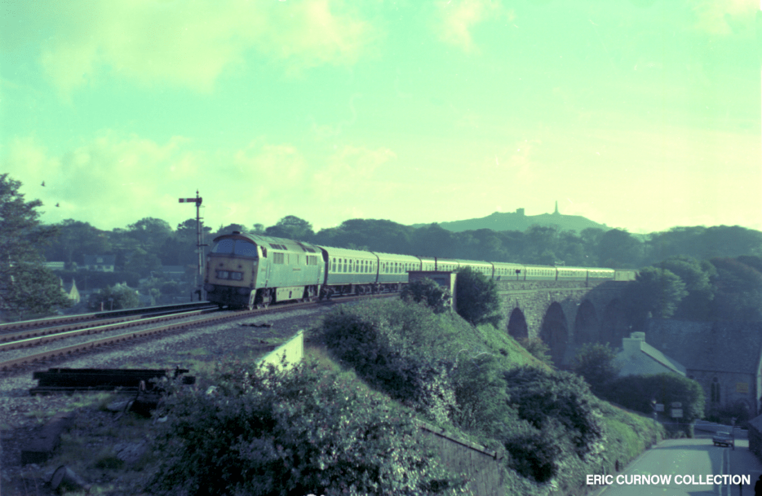 A calm familiar scene to me of a ‘Western’ – in this case D0163 ‘WESTERN MONITOR’ – slowing with an up evening passenger at Redruth in 1974. Its surroundings are softened by vegetation, and the silhouette of Carn Brea Castle and Basset Monument are clear against the sky in the background. All is quiet in the empty street below the embankment. 19740912A01-PNZ-D1063-PAS-U