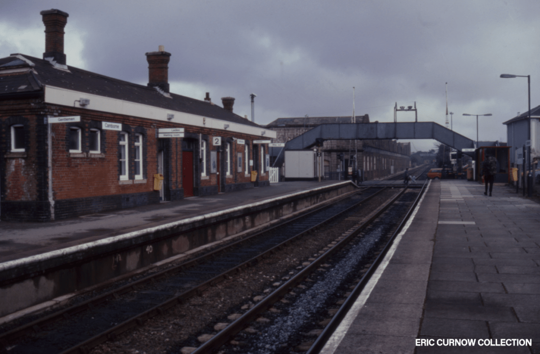 A car and push chair rumble over the crossing at Camborne Station, under the eye of the CCTV camera controlled from Roskear Box further down the track. The red rear door of the final carriage of the uptrain that has recently passed through is visible in the same general area, and Holman’s rock drill plant, on the left in the middle distance, still has its roof on at this point. 9011##A01-CBN-STATN-VIS_E