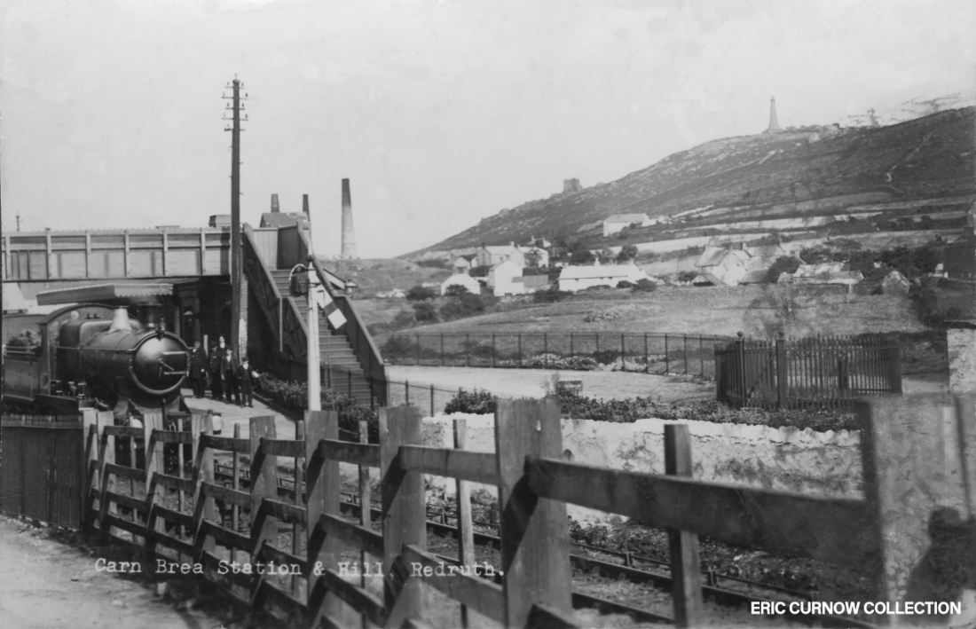 This picture postcard of “Carn Brea Station and Hill” shows a down train locomotive stopped at the station as five staff members stand proudly beside it for the photographer. There is a lot of fencing in the picture, and behind the hamlet of Tregajorran some of the many mine chimneys that once covered this area, with Carn Brea Castle and the Basset Monument on the skyline. #####B01-CBY-STATN-VI_SE