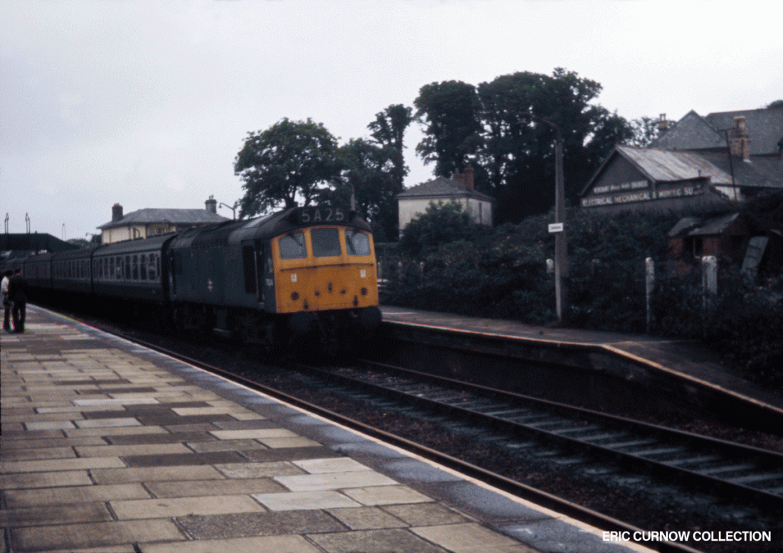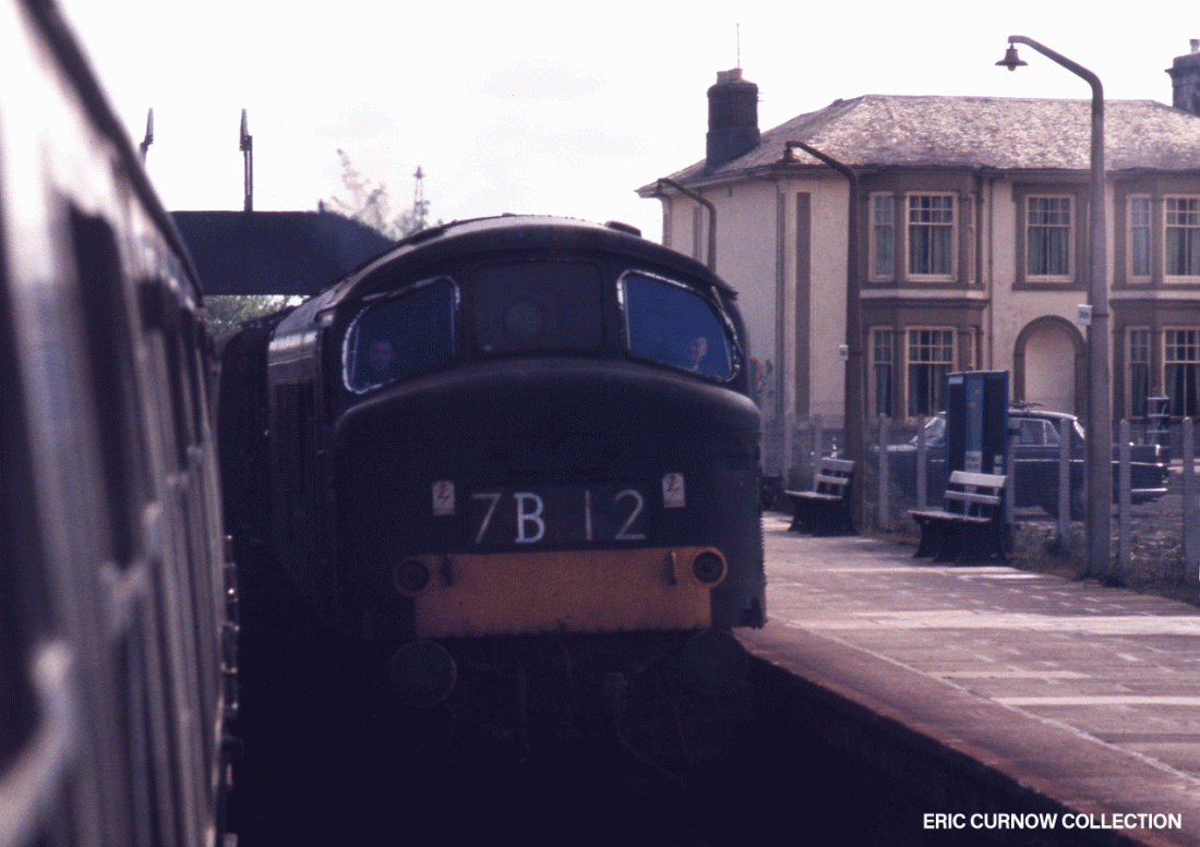 D1051 “WESTERN AMBASSADOR” arrives at Redruth, windscreen wipers waving, on a wet day in the early 70s with the Bradford service. The rain is so heavy even the platform surface under the awning is coated, and Carn Brea is indistinct in the murk beyond. It was quite a pull to lower the signal at the end of the down platform from Drump Lane box! 7####GO01-RED-d1051-PAS_U