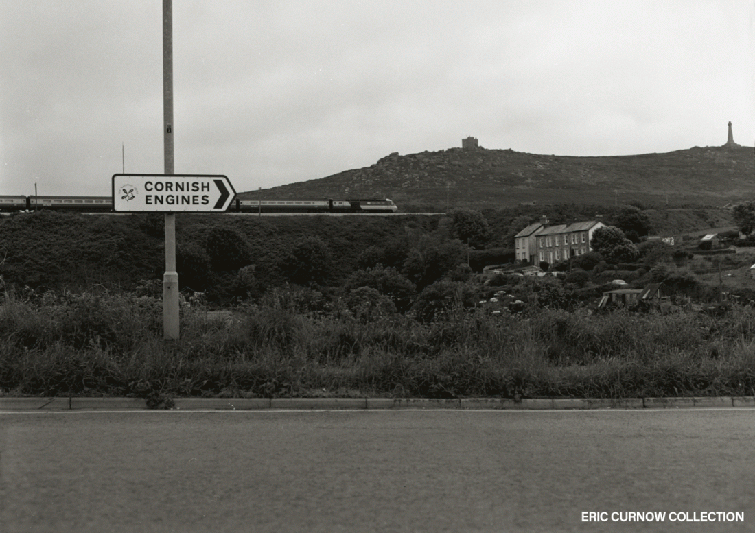 A High Speed Train runs westwards before Carn Brea with the Castle on the left and Basset Memorial on the right – taken from the end of the Redruth by-pass, that was a very familiar sight to me when coming back from Sunday afternoon family car rides farther east. Telegraph wires still line the trackside in 1981. Photo: John Vaughan. 810611A01-RED-2~###-PAS_D