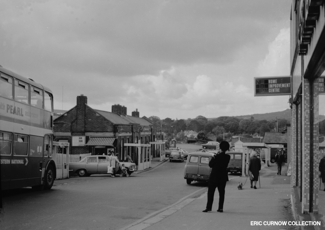 Redruth Station frontage with a view looking South West towards Carn Brea and the radio mast at Lanner Hill – faintly shown between the bus and station café – about a month before I went to college in the next street. The home starter signal is at the centre of the picture, with the viaduct curving west below the tree line, just hidden from view. 740817A01-RED-STATN-VI_SW