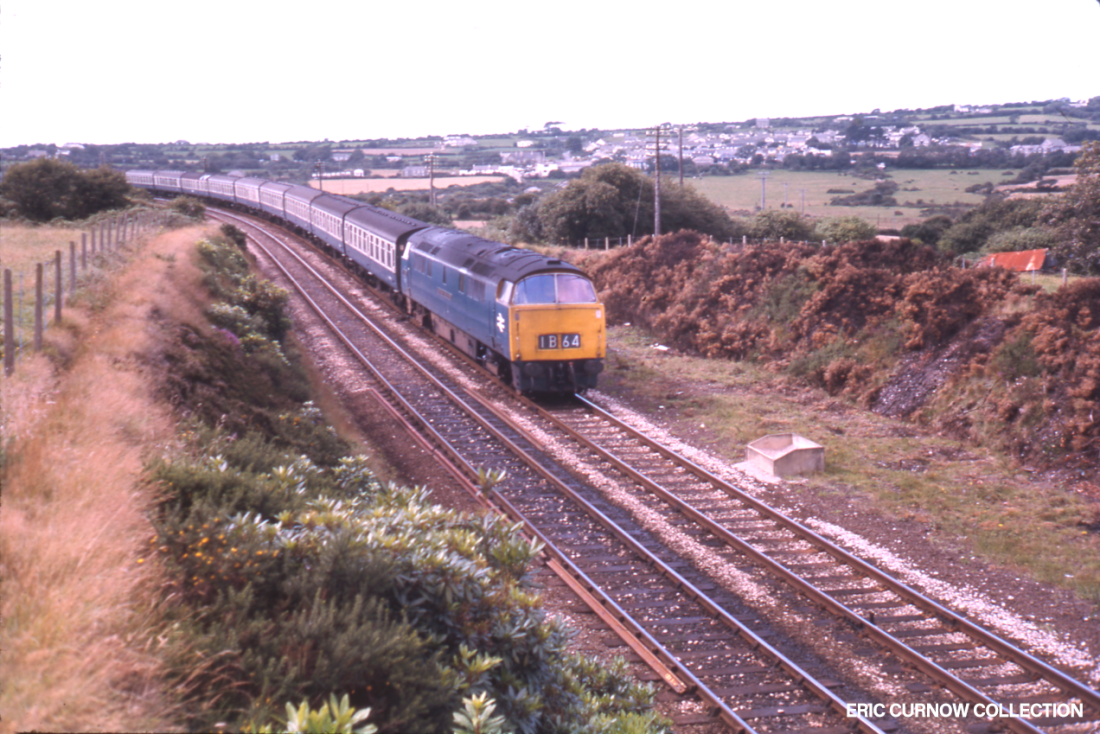 Nearing Chacewater, D1026 “WESTERN CENTURION” slows for the sharp bend before the former station, viewed from the over bridge west of the station. The space to the right of the tracks is where the former Perranporth branch line once lay, now encroached by gorse, and before the loco is a hopper for ballast tamping by gangs who walk the trackbed. 7406##A03-CWR-D1026-PAS_U