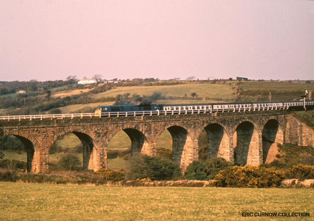 The remaining arm of the signal has dropped and crossing Blackwater Viaduct just east of Chacewater is D1059 “WESTERN EMPIRE” with a “down” passenger service; thick black exhaust indicating it is gearing up for the incline beyond the station. 7404#AA01-CWR-D1059-PAS_D