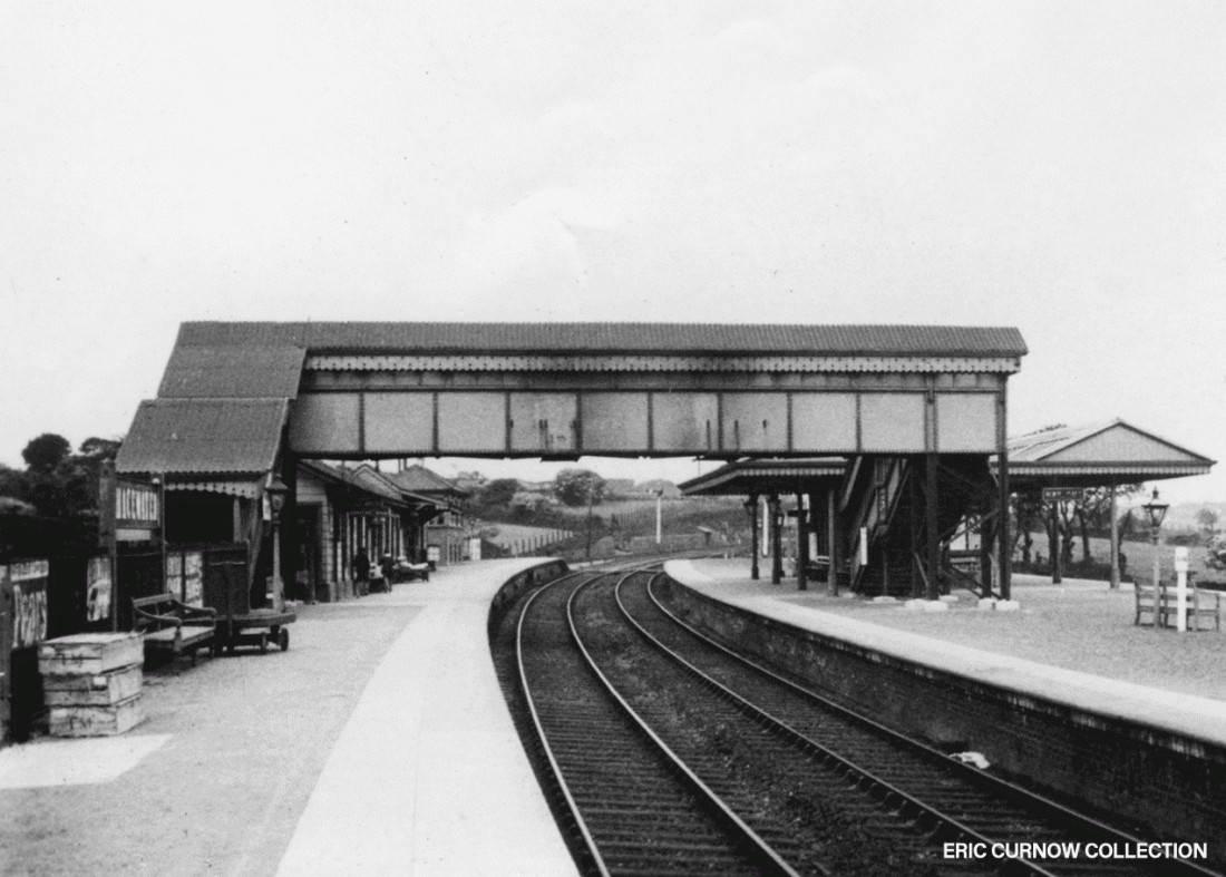 This 1920s picture of the eastern side of Chacewater Station shows the buildings and signal box on the left with footbridge leading to the island platform and its shelters at the right. The running in board is cast iron. © Locomotive & General Railway Photographs. 2####AB01-CWR-STATN-VI_NW