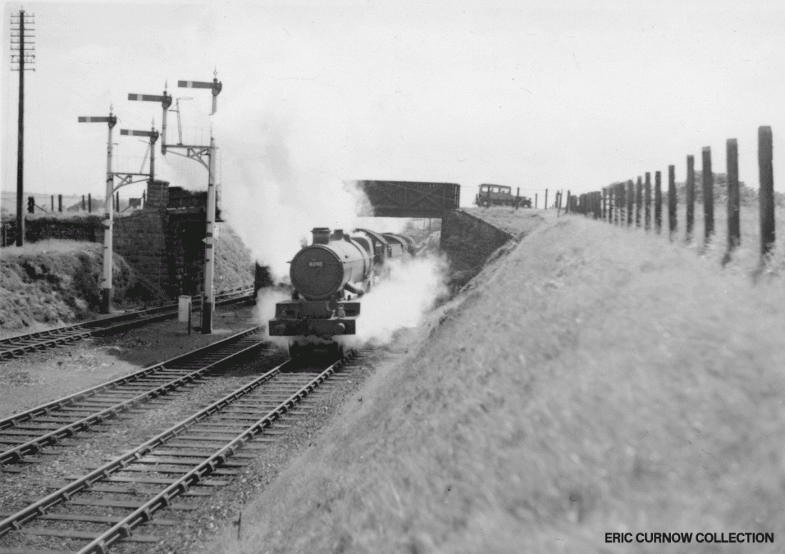 4090 “DORCHESTER CASTLE” furiously ejects steam as it emerges from the first bridge west of Chasewater with a train for Penzance. Although both bracket signals carry a diamond plate indicating “no telephone”, there are a couple of cabinets beside the nearest. 3####AA05-CWR-s4090-PAS_D