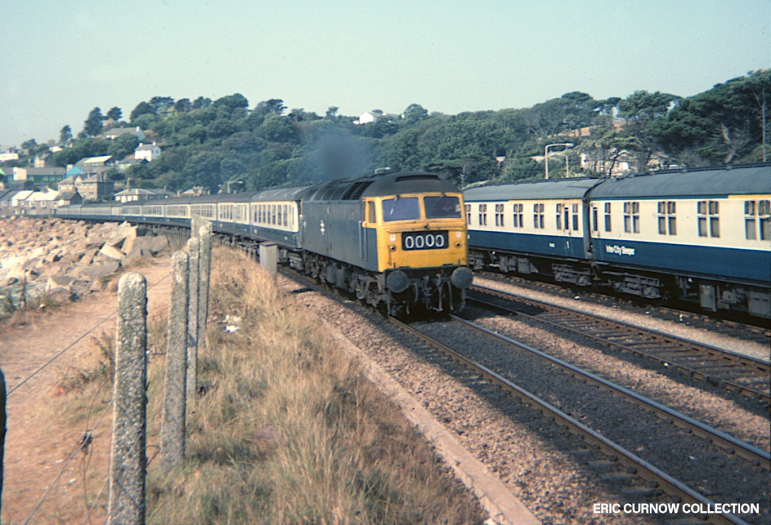 The vegetation in this slide seems very parched as unusual visitor 47201 passes through Ponsandane in the hot Summer of 1976, its headcode turned to “zeros”, hauling an up passenger service. Although the drought made cleaning difficult, a rake of very presentable sleeping cars awaits reuse in adjacent Sloper’s Siding, the yellow stripe indicating first class provision. 76###AN01-PDN-47201-PAS_U