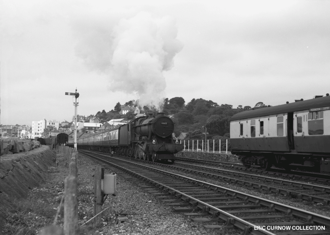 Watched by schoolboys behind Sea Siding stock, 1002 ‘COUNTY OF BERKS’ blasts away as it drags an up express through Ponsandane. It is about to pass a half brake second in Sloper’s Siding. Sadly the trees beside the railway are no more. 5####AZ01-CYR-s1002-PAS_U