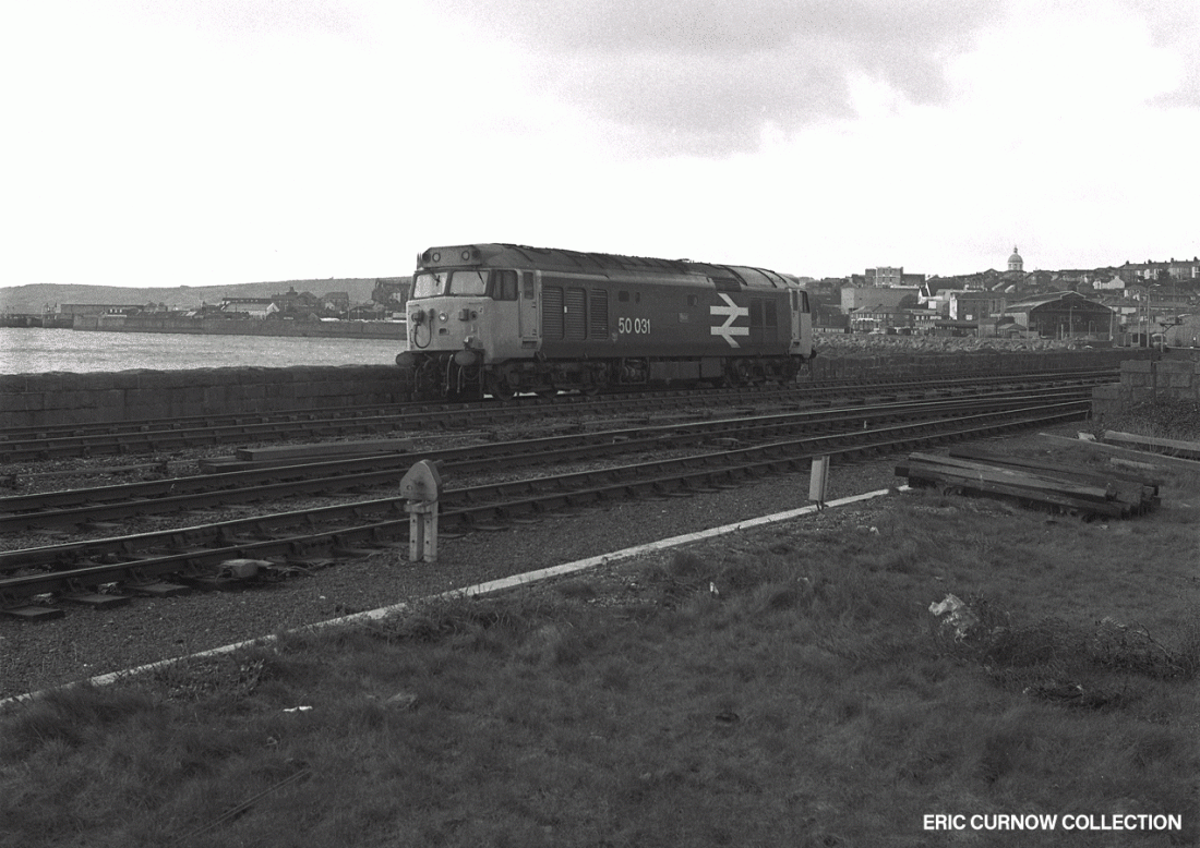 Displaying perspex disks in its headcode box, the doyen of its class, 50050, powers away with a train of ACS and a GUV into Ponsandane. A sunbather is near the water, and two men amble along the raised walkway towards the town. 780712A01-CYR-50050-PAS_U