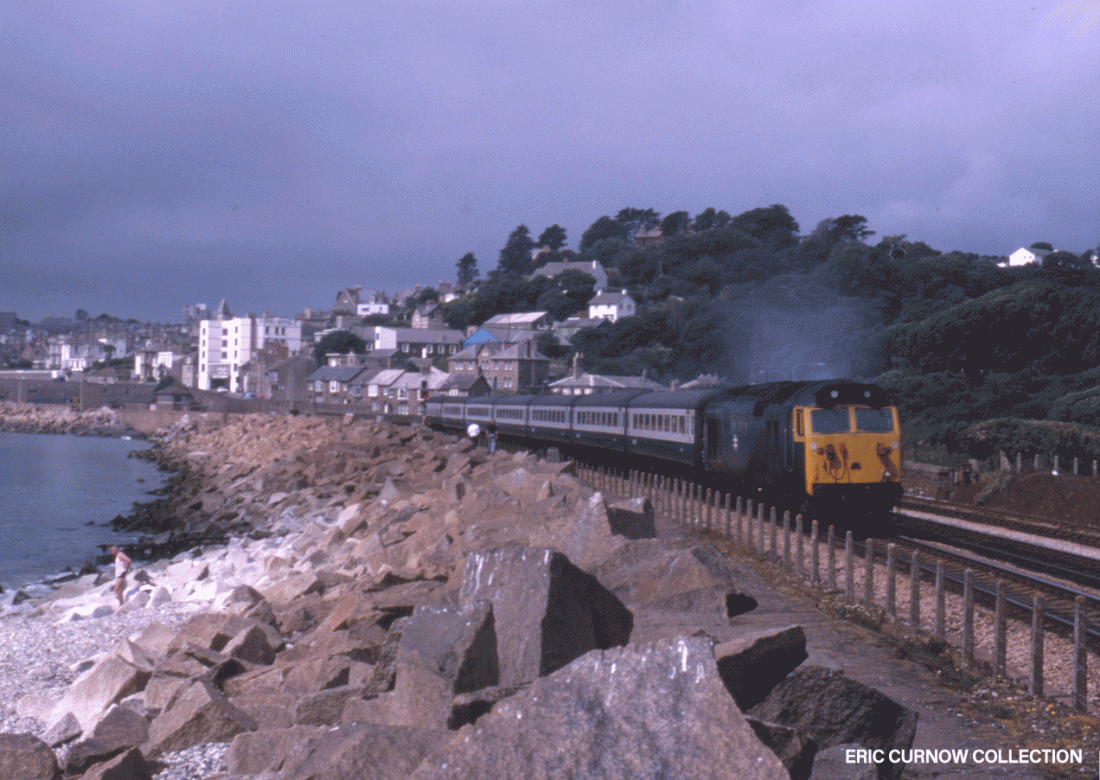 A dismal rainy day finds 50045 and a class mate parked in the short sea siding against the wall at Chyandour in the late 1970s. I was always in a bit of a quandary passing locos as I walked the sea wall, happy to view them closely and feel their warmth and smell, but also wary that a loco man might upbraid me for trespassing from a cab as I passed along beside them. 7####GQ01-CYR-50XXX-PARKD
