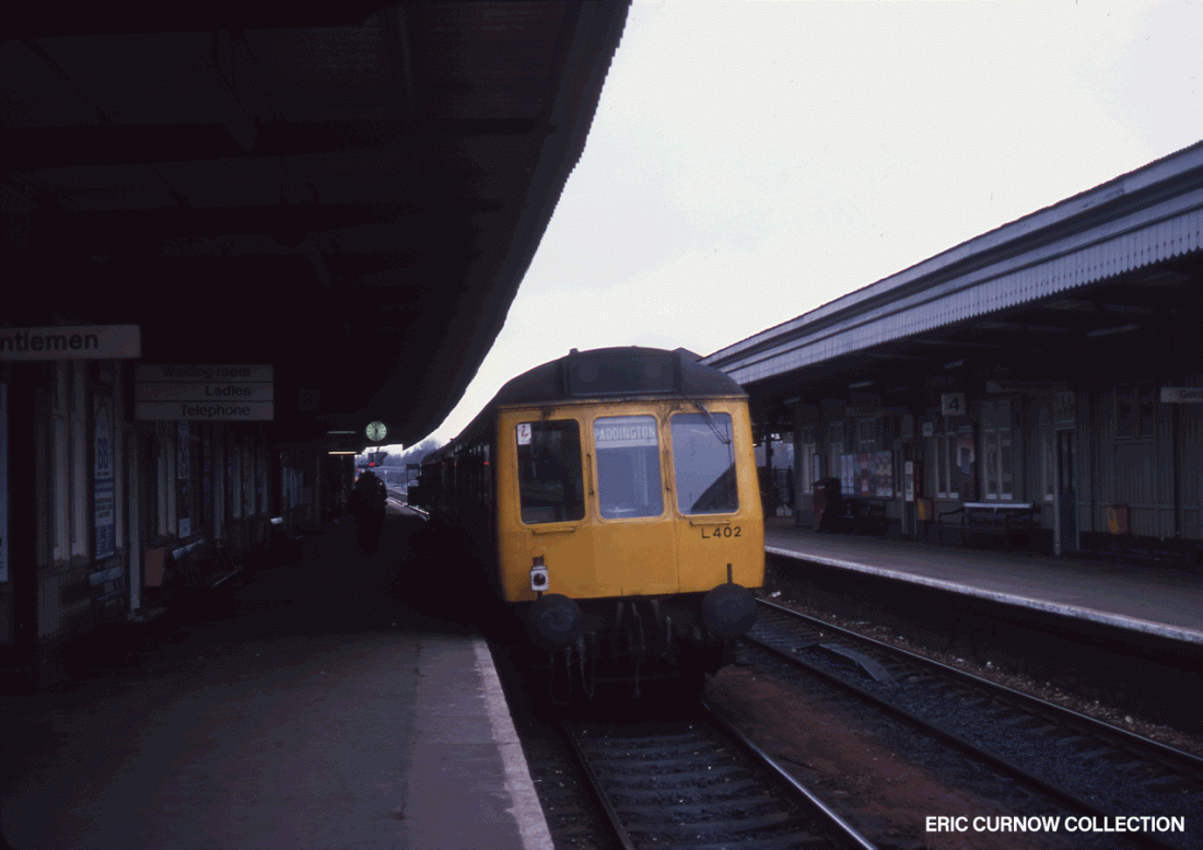 A Class 117 DMU heads another three-car set in a train from Paddington to Oxford, paused at the junction station of Didcot to set down and take up passengers in 1979. I can remember this scene several times from Didcot Railway Centre visits. 790303A01-DID-DMUX6-PAS_D