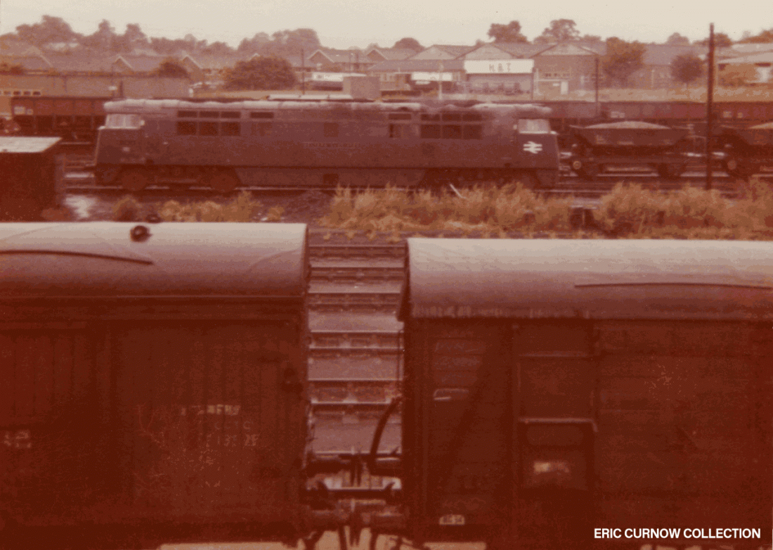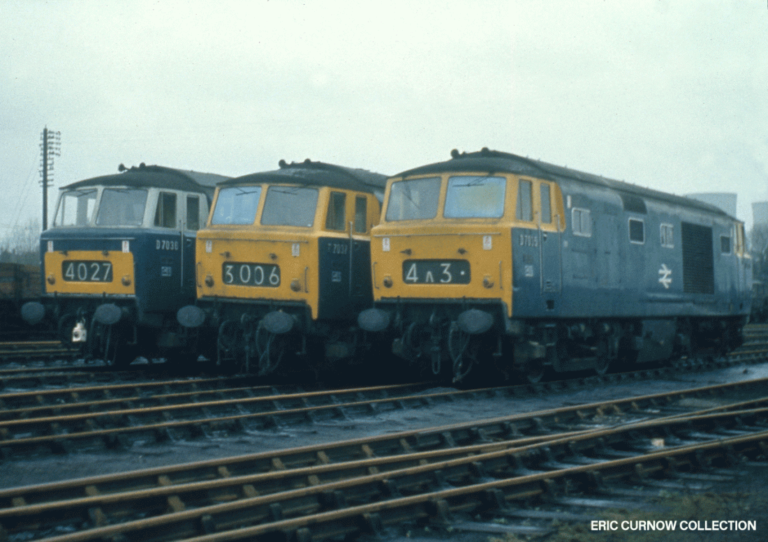 With the cooling towers of Didcot Power Station behind them, D7036, D7037 and D7035 respectively are neatly lined-up like peas in a pod, as they await new duties, although D7036’s small yellow panel livery varies from the others. The second digit ‘O’ denotes Southern Region workings. Copyright: CTLS. 7108##A01-DID-D7XXX-PARKD