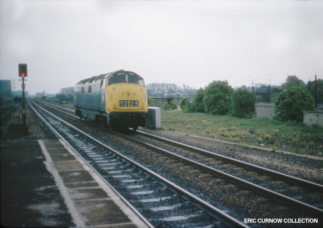 Prototype High Speed Train 252001 is in a very short formation as it passes west through Didcot station in 1974, possibly in one of its UK railway speed record attempts. It’s headcode is three lights, all the more visible because of the dark drizzly day of it’s visitation, and there seem few present on the platforms to witness the unusual sight. 74###AQ01-DID-2~001-TES_T