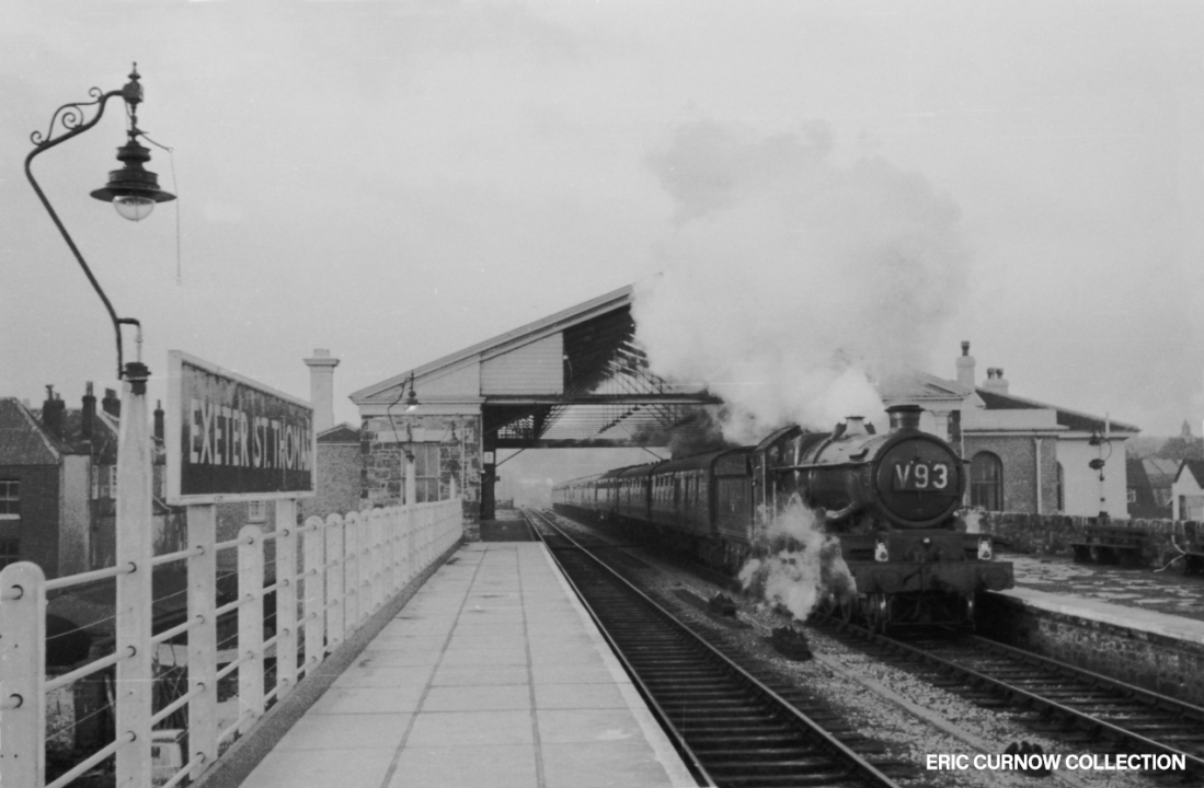A ‘Castle’ Class locomotive heads a passenger service westbound through Exeter St Thomas Station in 1961. Ex-GWR era gas lamps still line the platforms although BR maroon and cream running-in boards have been erected. I can remember the overall roof and the later shock of its removal, from an east-bound train, and marvelling that a station could be built on a narrow viaduct. 61###AL01-EXT-CASTL-PAS_D