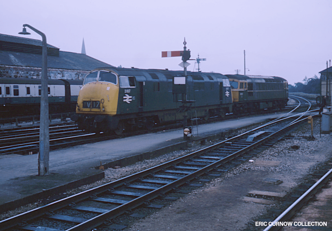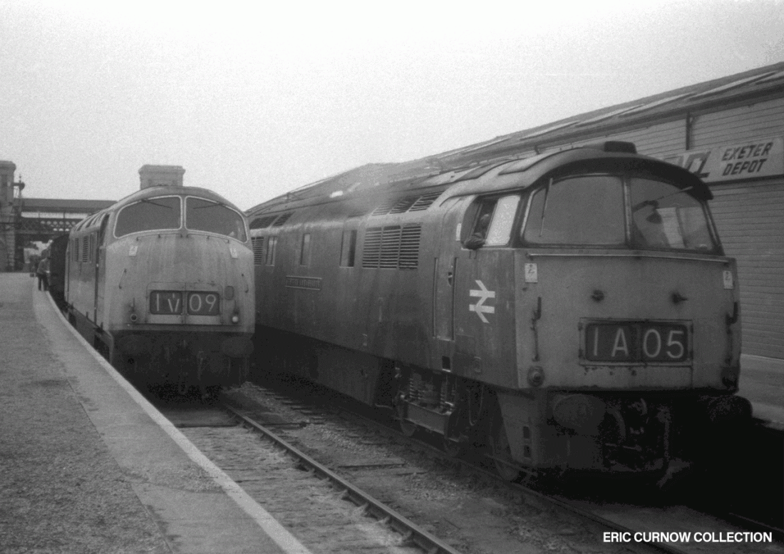 D809 “CHAMPION’ heads through Exeter St David’s towards Bristol with “the Bradford” in September 1971 – still in bleached and battered maroon livery, double-heading the service with a shiny new ‘Peak’ not long out of the paintshops. Behind is the familiar GWR Goods Shed that sadly burned down some years afterwards, preventing preservation. Photo: S. Carter. 7109#AD01-EXD–D809-PAS_U
