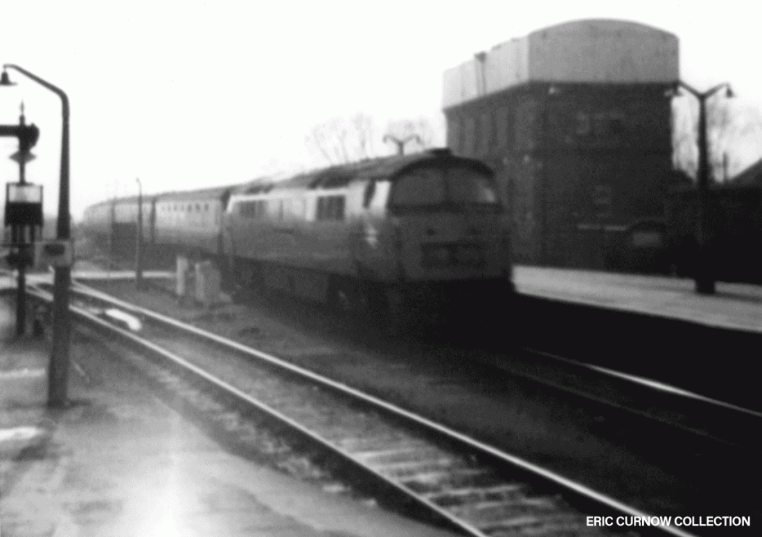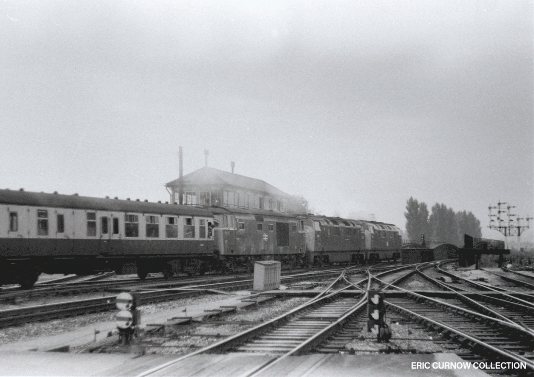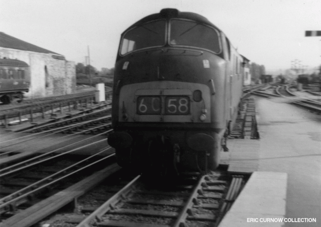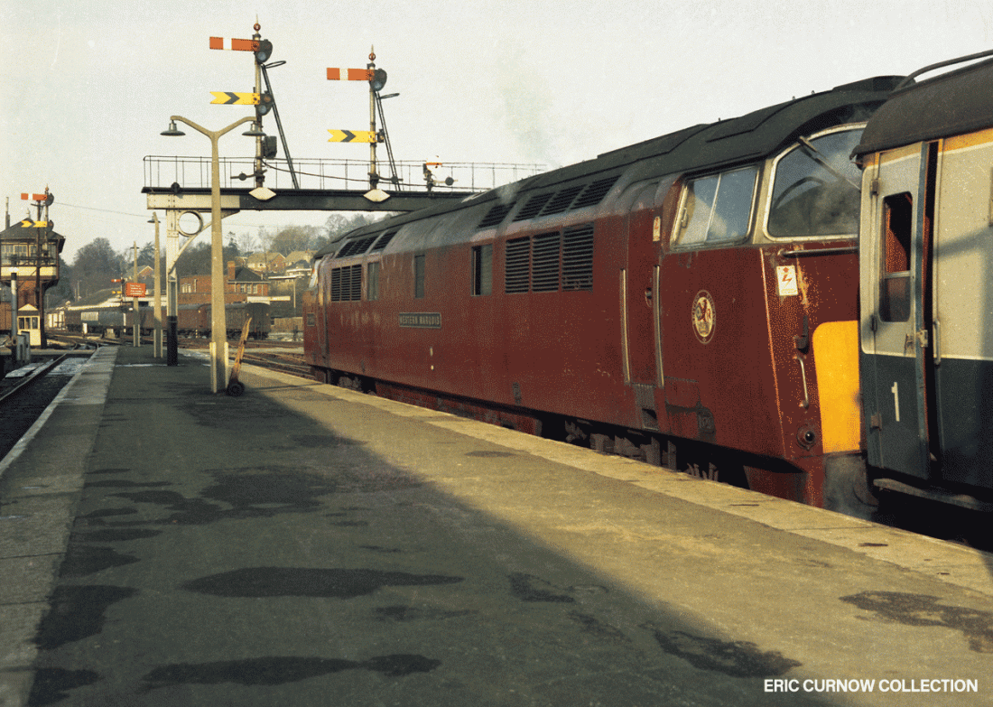 A ‘Western’ enters Exeter St David’s from the Plymouth direction on a winter’s day. The Water Tower – soon to be demolished and the new Power Signal Box erected on the site – dominates the scene, and a signed semaphore guards the storage sidings. 7304#AA04-EXD-D10##-PAS_U