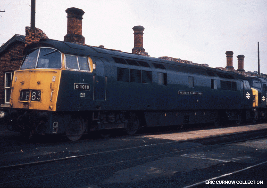 D1010 “WESTERN CAMPAIGNER” waits with a Class 46 in the remains of the old steam shed at Exeter St David’s stabling point. The walls largely remain although the roof has gone – retained because the ancillary offices are integral to the structure. 7508##A01-EXE-D1010-PARKD