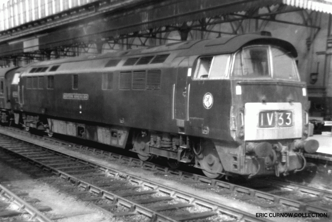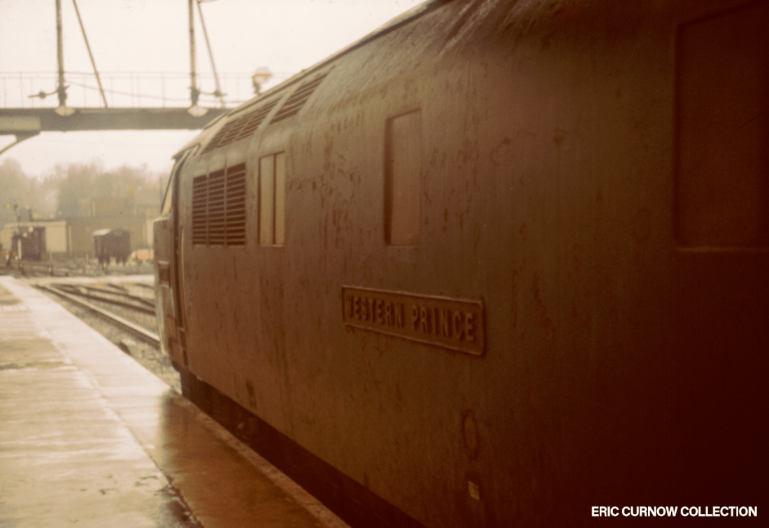 A closer view of D1038 “WESTERN SOVEREIGN” at Exeter St David’s shows a battered front corner, presumably from a side-swipe with something quite substantial. Its centre sides are coated with oil, and it appears to be running on only one engine. 69###AM01-EXD-D1038-PAS_D