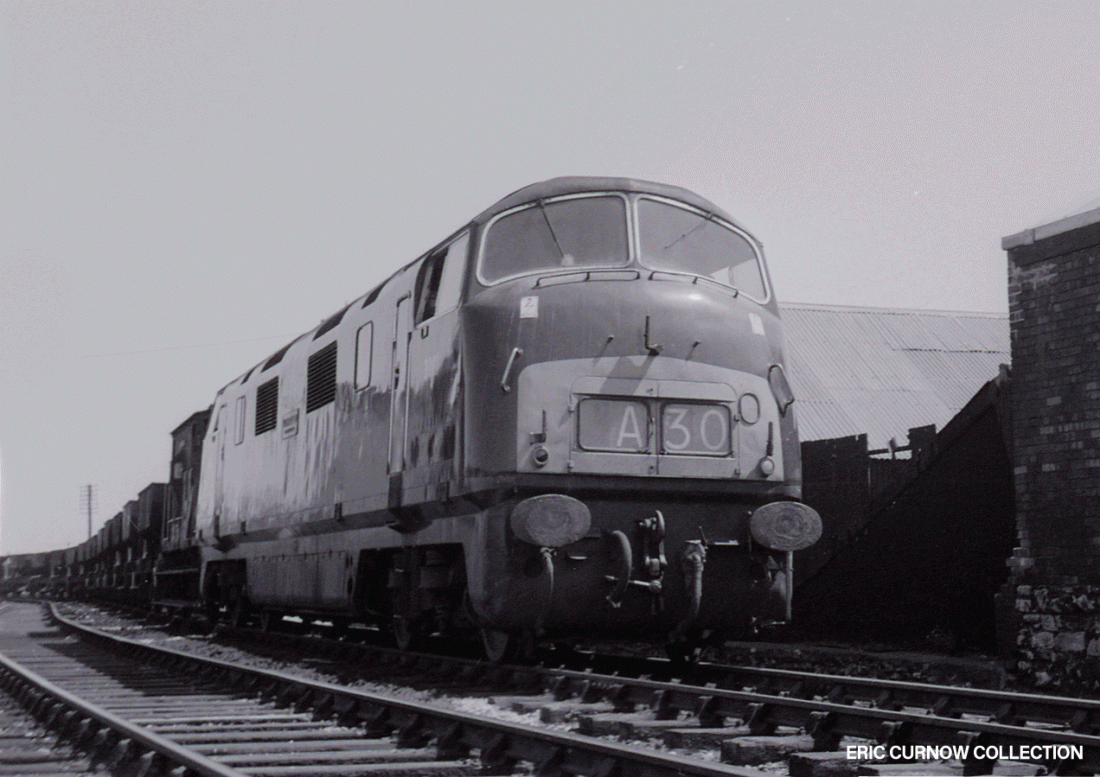 An elbow of a relaxed second man protrudes from a cab window as D1051 “WESTERN AMBASSADOR” awaits permission to proceed east from Exeter St David’s station. Beside it, a D8XX ‘Warship’ draws away from a rake of vans being loaded as the loading constraints are being checked. 7####FR01-EXD-D1051-PAS_U