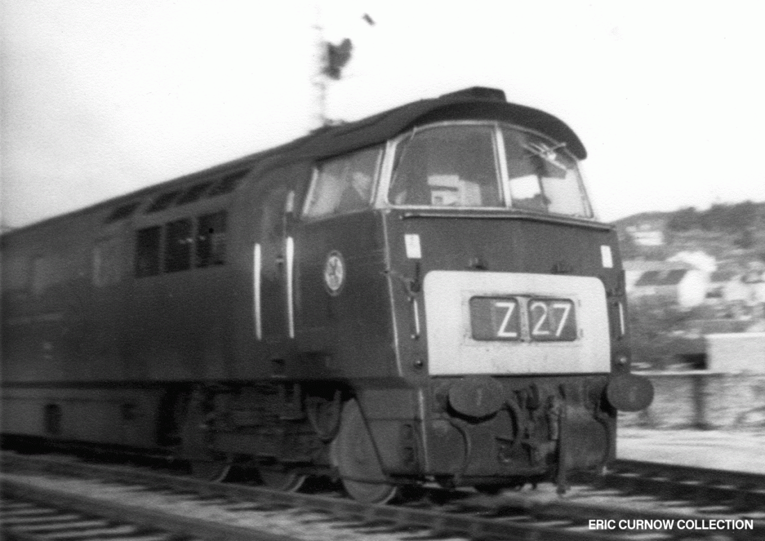 In about 1966 D870 “ZULU” runs out of Exeter St David’s Station towards the railway bridge across the River Exe before returning by the lines on the right to the depot. Exeter West Box is behind the locomotive, and buildings, with the curve to Central, on the left. 66###AA01-EXD–D870-LIGHT