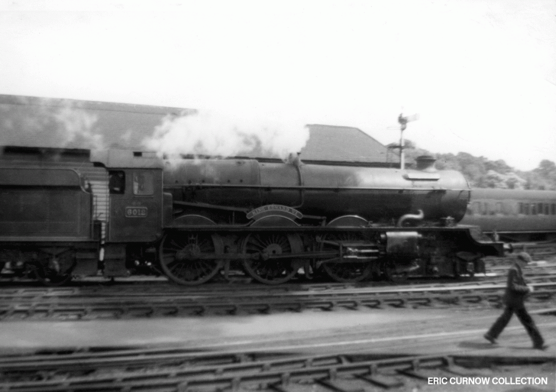 6012 ‘KING EDWARD VI’ slowly chuffs into life while leaving Exeter with a westbound express passenger service on 19th May 1956. The carriage sheds and hillside trees are behind, and a railway worker strides the duckboards oblivious to the familiar sight. 560519A01-EXD-s6012-PAS_U