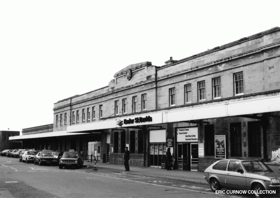 The grand façade of Exeter St David’s Station, the sandstone blocks a little weather-stained, with a queue of taxis waiting to ply their trade. The signage dates it later than the era I am interested in, but it is still essentially the same as when I first saw it. 6####BF01-EXD-S_BLG-BLDNG