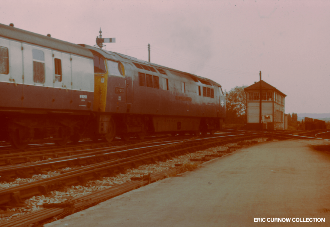 The ‘Barrow Crossing light’ is on as D1051 “WESTERN AMBASSADOR” crosses the lines curving left to Exeter Central, and is about to pass ‘Exeter West Signal Box’ on its way west in the mid 70s – the building now happily preserved at Crewe Heritage Centre. The locomotive is in surprisingly reasonable external condition at this late stage in its service life. 7####GF04-EXD-D1051-PAS_D