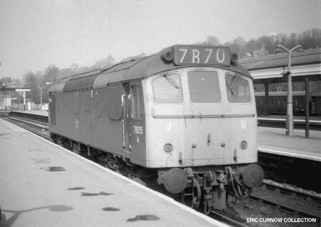 With the paint on its cab handrails worn by countless ascents, Class 25 loco 7625 runs around it’s Barnstaple train before re-departure north, at Exeter St Davids Station. Puddles in the foreground show rain not many hours previously, and the backdrop, trees largely decimated by development now. 7####FG01-EXD-d7625-LIGHT