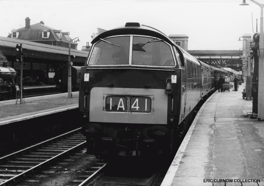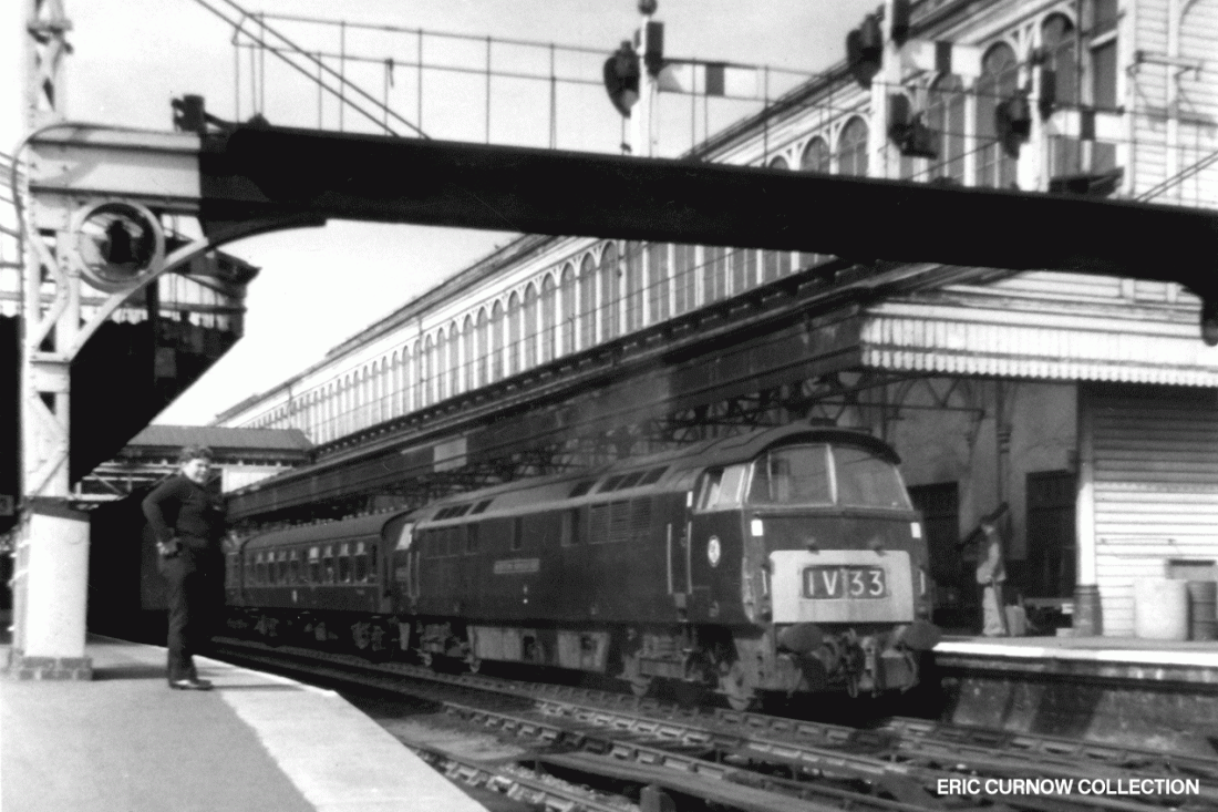 About 1969, D839 “RELENTLESS” pulls into Platform 5 at Exeter St David’s Station with an “up” service – a sight sufficient to create interest in a bystander. The coaching stock behind is in matching maroon; there is a DMU in the next platform. 6908#AF01-EXD-D839–PAS_U