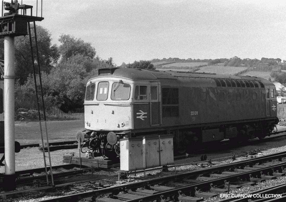 Parked against impromptu stop blocks, 33011 waits for reuse. The scattering of sleepers, semaphore signal, point rods and signal wires all point to the MAS resignaling of the area. The engine displays the default block headcode panels, as no longer needed. 7####DE01-EXD-33011-LIGHT