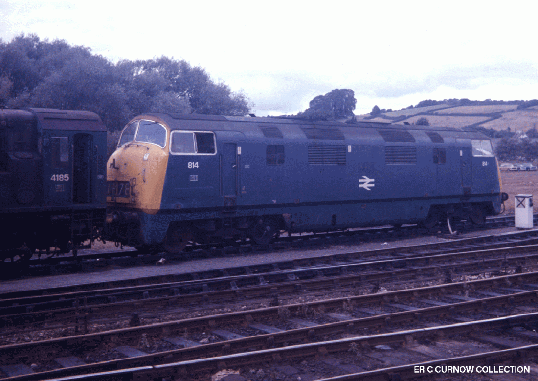 814, shorn of its ‘DRAGON’ nameplates, is buffered up to 4185 in the sidings across from the platforms at Exeter St Davids. This loco’s days were definitely numbered by now! The empty tracks before it run to the Stabling Point, right, and main line, left. 720911A01-EXD-d814–PARKD