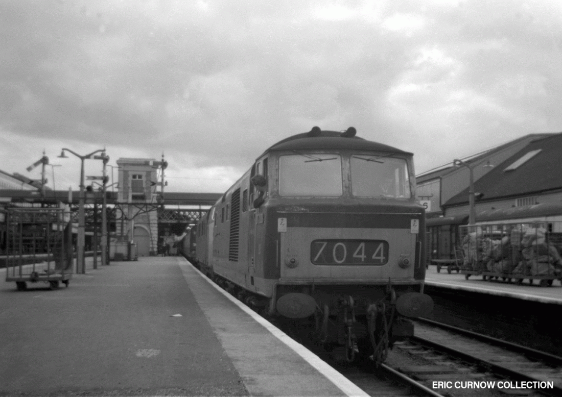 The Second Man looks back as D7008 draws away from a train with a “Warship’ loco – the ‘7004’ is its journey code. Loaded BRUTEs on the adjacent platform await the arrival of an up parcels train and Platform 2 is signalled for a down, stopping, arrival. 700826A01-EXD-D7008-LIGHT