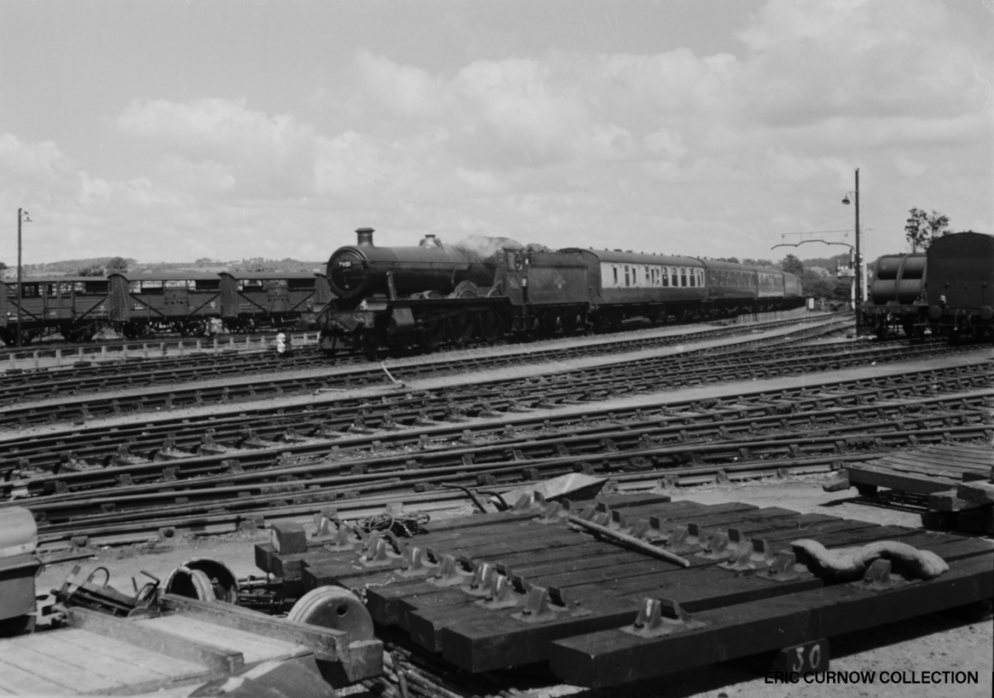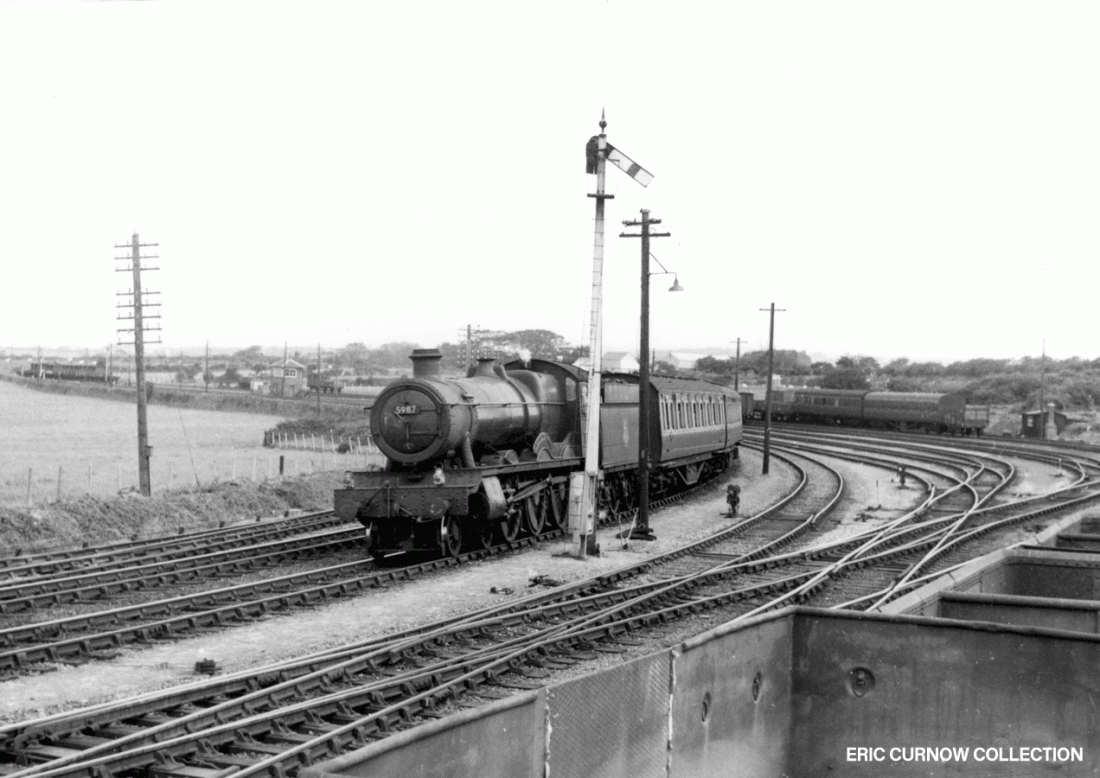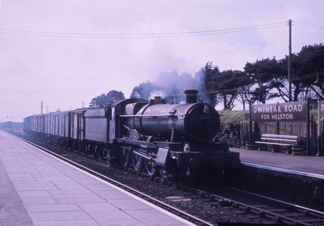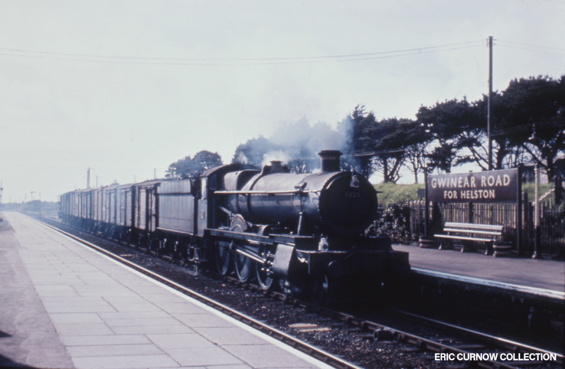 5987 “BROCKET HALL” rounds the curve into the east end of Gwinear Station past a spare set of branch coaches and the normal assortment of open wagons and cattle trucks, now largely used for broccoli from the farms down the Lizard peninsula. 57##99A01-GWI-s5987-PAS_D