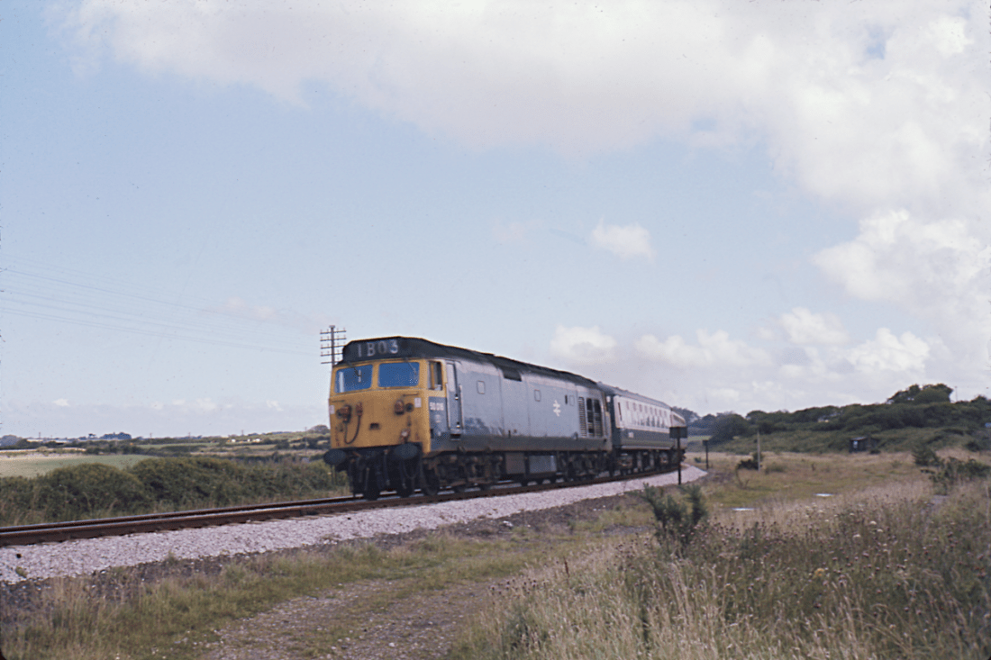 Now all seems clear at the crossing, the driver of 47478 applies power as tthe curve eastwards is rounded with a train of Mk1 carriages at the former Gwinear Road Station in 1981. The ’47 still has a glass headcode cover, and unusually carries a BR emblem on a cabside. To each side of the picture vegetation grows prolifically over the former platforms. 81####B01-GWR-47478-PAS_U