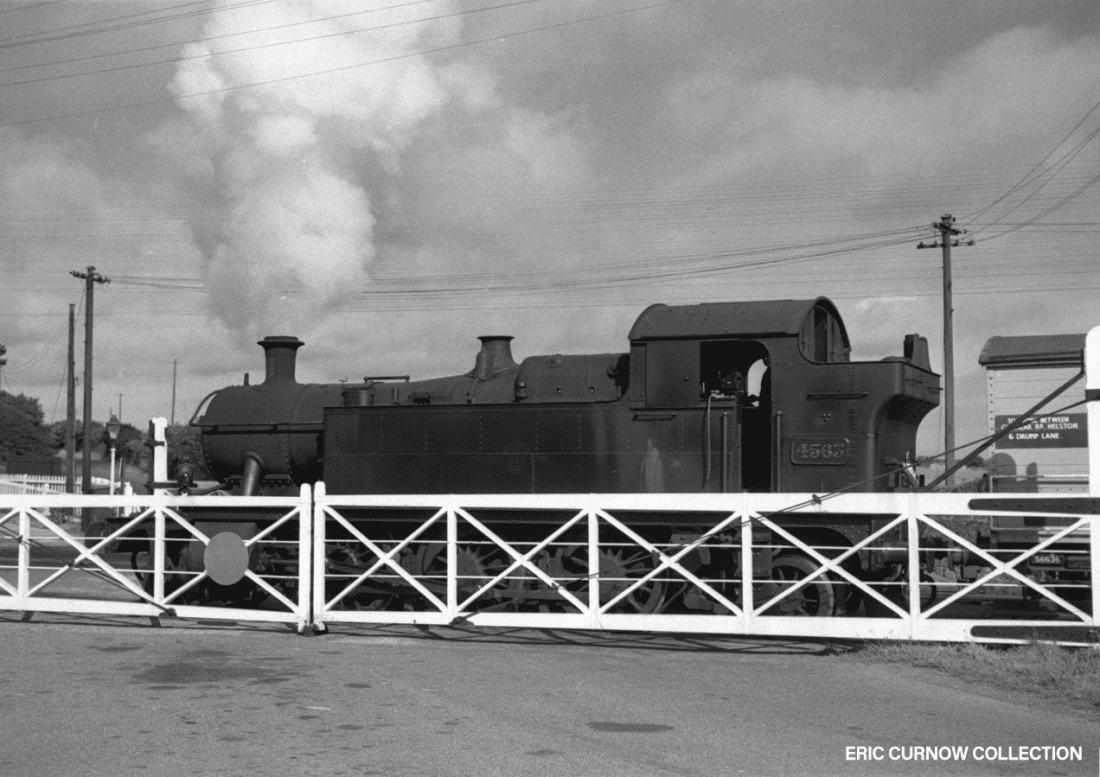 4563 shunts across the level crossing at Gwinear Road Station protected by very long crossing gates. Its exhaust rises vertically into a maze of telegraph wires, and a van behind proclaims use between Helston, Gwinear Road and Drump Lane only. 610922A01-GWI-S4563-SHU_G