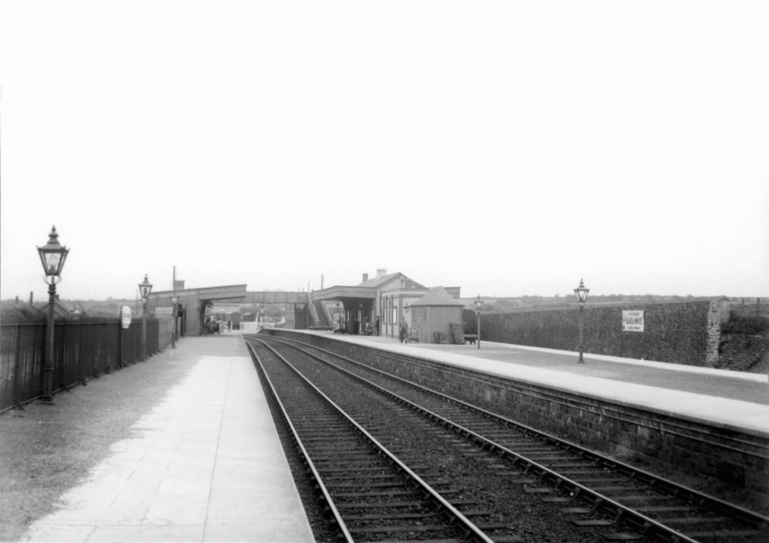 Gwinear Road Station, looking to Camborne in 1920. A wooden 316 milepost is on the up platform amid the gas lamp standards, and on the retaining wall opposite there is an enamel advert for ‘Black&White” scotch whisky. Emphasised by the wide platforms, everything has an air of solid permanence. Copyright: L&GRP. 20###AA01-GWI-STATN-VIS_E