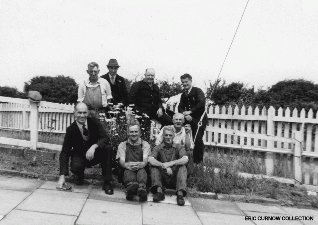 Staff photographed on the ramp of a platform at Gwinear Road circa 1960. A boundary fence is behind and handrail/barrier in front. I was too young to remember the station but must have used it to ride on one of the last trains on the Helston Branch. 6####FG01-GWI-STAFF-POSNG