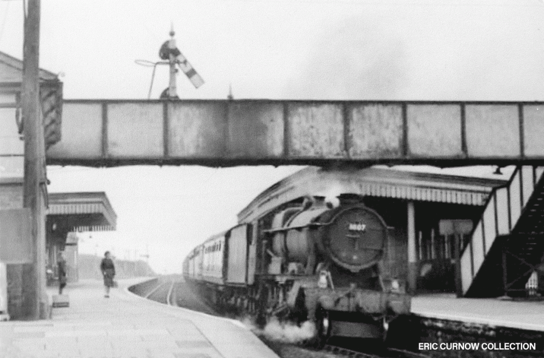 “COUNTY OF BRECKNOCK”, 1007, takes the attention of those waiting on the opposite platform as it leaves Gwinear Road Station with an “Up” passenger service on 13th August 1959. The West Signal Box can be seen on the platform at far left. 590813A01-GWI-s1007-PAS_U